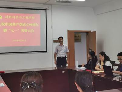 无机非金属材料工程系主任张连营代表获奖党员发言,分享了作为一名普通党员在教学、科研、专业建设等方面发挥模范带头作用的经验和成长过程。
