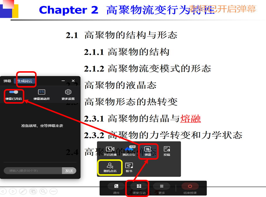弹幕   教师提问问题,点击“课堂互动”- 开启弹幕