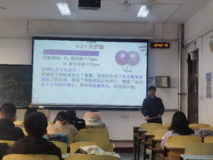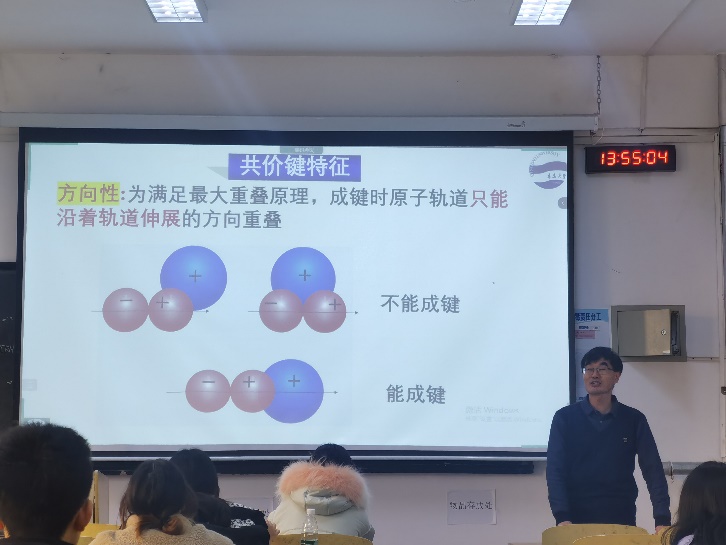 此次课程,李培耀老师讲授的是《无机化学》中《共价键的特征》小节,首先复习共价键理论的形成,结合第五章原子结构的特征,强调了原子结构的价电子构型决定了共价键的形成过程和特征,并通过提问快速回答的方式回顾了几种典型的原子如BCNO价电子构型的不同及spd轨道的特征;掌握节奏引导思考,自然引入了共价键形成后的特征;注重物质结构的知识特点,通过动画、图片及手势演绎等方式,引导学生的思考,加深概念的理解。
