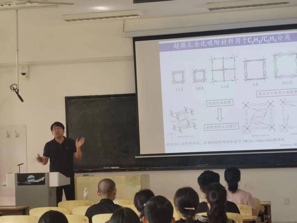 邀请,在浮山校区博学楼304作了题为《微孔配位聚合物的定向合成与气体分离应用》的高端学术报告,五十余师生听取了报告。