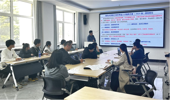 会议伊始,高分子材料与工程专业王世超主任作专题汇报,基于《青岛大学修订本科专业人才培养方案(2025版)原则意见》,王主任通过详实的数据对比,系统分析了2021版人才培养方案实施成效及存在问题,重点解读了2025版人才培养方案的修订要点,如优化学分结构调整,创新课程体系建设,强化实践教学安排等。