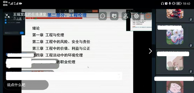 王瑶老师首先介绍《材料工程概论》课程三个模块之一工程伦理模块的内容、教材及在线学习资源,从案例分析出发,结合学生专业背景,引入课程伦理内容;注重在线授课互动,顺利开展线上教学。