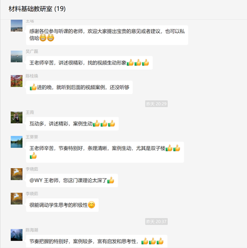 为进一步提升电子游艺 青年教师课堂教学能力,结合新形势下线上课堂授课模式发展,材料基础教研室组织开展了系列观摩课。4118:30,校“教学十佳”王瑶教授进行第一讲,通过钉钉直播方式,为电子游艺 2021级材料类本科生进行《材料工程概论》之工程伦理模块内容的首次授课。材料基础教研室老师全部参加观摩。