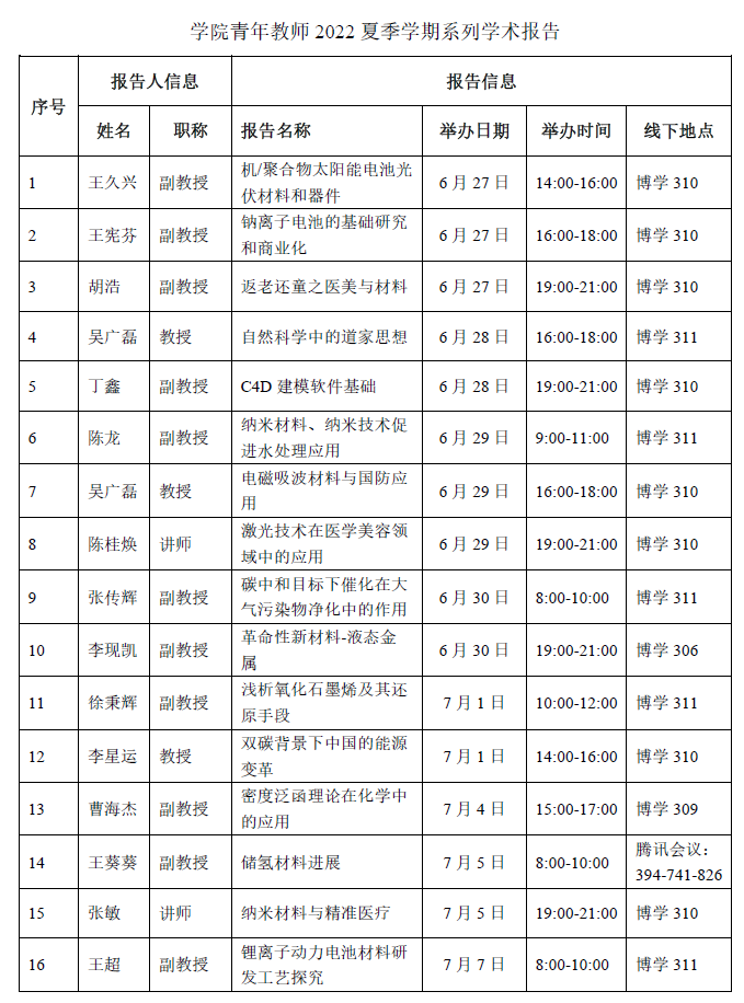 为开拓学生的知识视野,培养学生的科学素养和创新精神,提高学生的综合素质和能力,电子游艺 于2022年夏季学期组织电子游艺 优秀青年教师为本科生做了系列学术报告,627日至77日,十大电子游艺 共组织15位青年教师采取线上或线下方式,举办了16场学术报告,报告详细信息见列表。