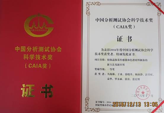 丛海林教授主持完成的国家自然科学基金项目《胶体晶体基传感器和色谱材料制备的新方法及新应用》荣获2016年中国分析测试协会“科学技术奖一等奖”,该奖项具有直接推荐国家科技奖资格。
