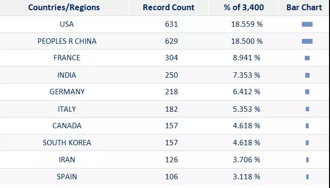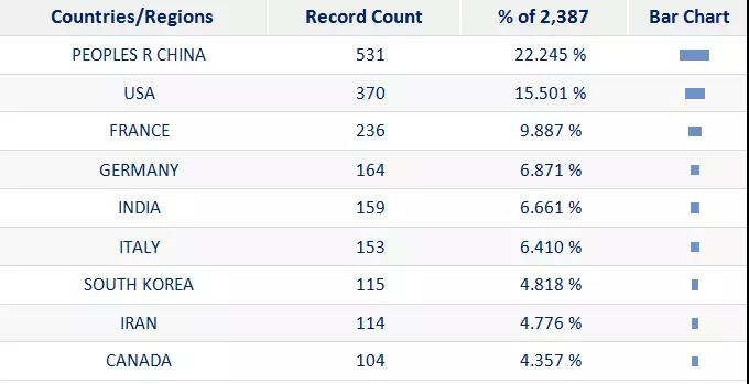 表3. 2007-2017年,国际填充改性高分子流变学领域SCI论文发表最多的十个国家/地区