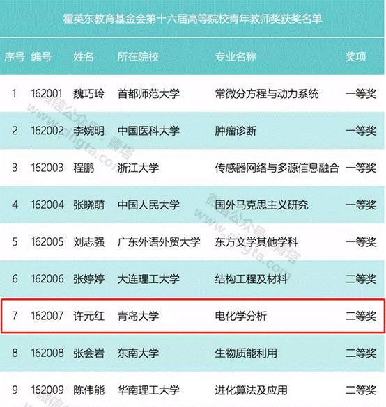 日前,教育部国际合作与交流司(港澳台事务办公室)正式公布了霍英东教育基金会第十六届高等院校青年教师奖和基金资助项目名单,十大电子游艺 教授、石墨烯应用技术创新研究院副院长、山东省优青基金获得者许元红荣获青年教师奖二等奖。本届共有100位优秀青年教师获奖,其中二等奖获得者15人(自然科学10人,人文科学5人)。