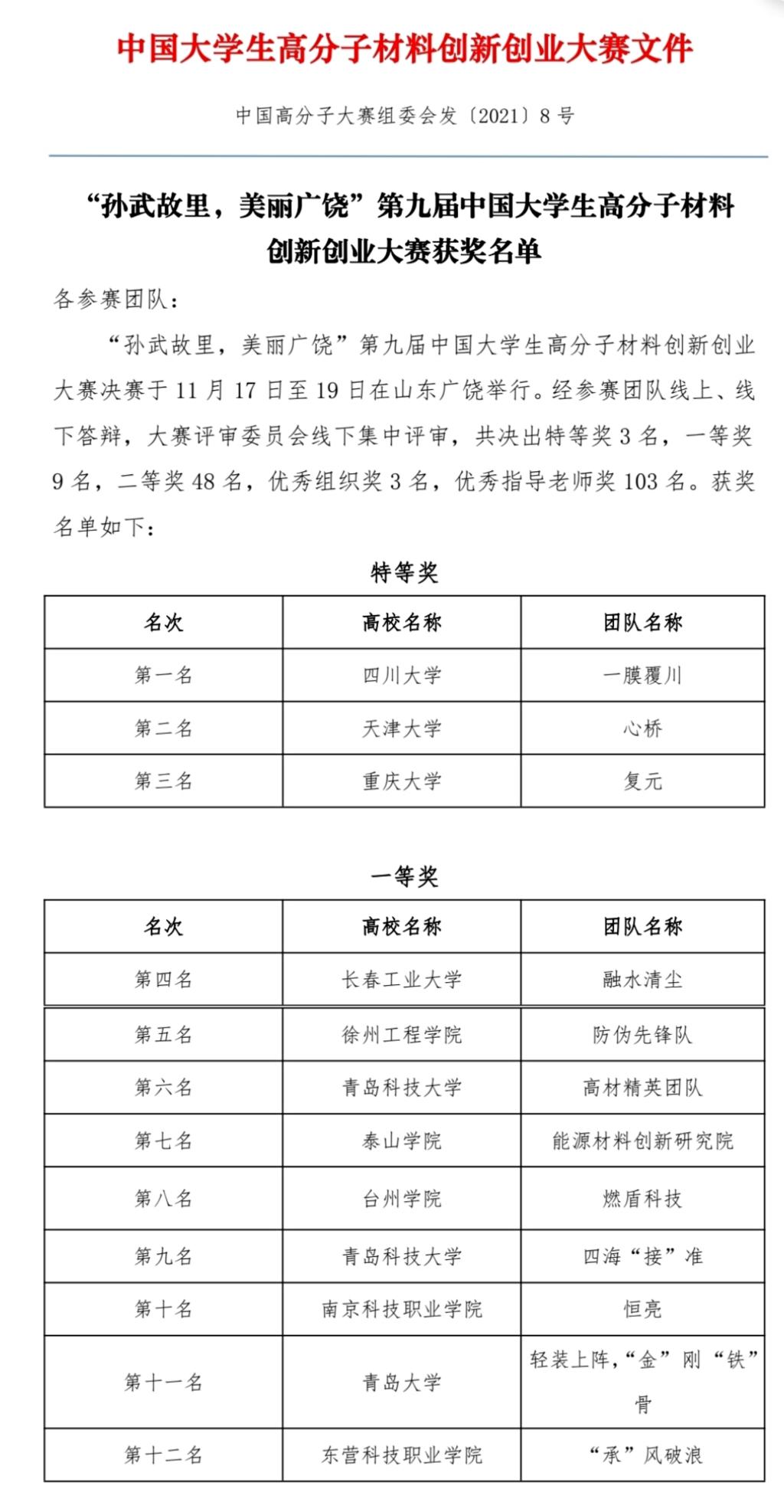 学生团队在中国石油和化学工业联合会、中国化工教育协会、中共广饶县委、广饶县人民政府和橡胶谷集团有限公司联合主办的“孙武故里,美丽广饶”第九届中国大学生高分子材料创新创业大赛(简称PMC大赛)决赛中获得一等奖1项、二等奖1项、三等奖2项,马丽春老师获评优秀指导老师。