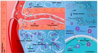 药物在肿瘤组织中的低渗透严重影响其疗效。本研究报道了一种双响应型药物载体。当纳米载体暴露于肿瘤细胞,GGT触发发生电荷反转,提高主动转运能力。同时TAT可将药物转运至核仁,释放DOX产生抗肿瘤活性。相关研究发表在Biomaterials上。十大电子游艺