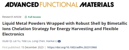 李现凯副教授在材料领域顶级期刊《AdvancedFunctional Materials》上发表题为“Liquid Metal Powders Wrapped with Robust Shell by Bimetallic Ions Chelation Strategy for Energy Harvesting and Flexible Electronics”的论文(DOI为://doi.org/10.1002/adfm.202313960),论文的第一单位为电子游艺-十大电子游艺