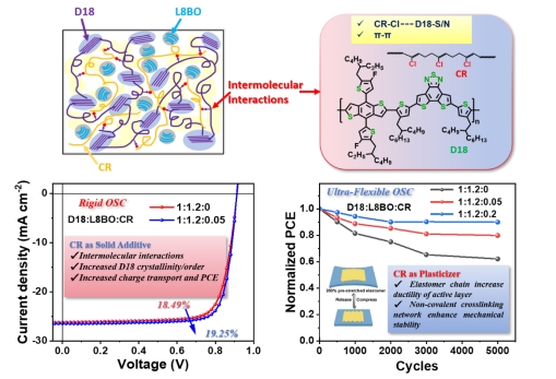为了解决这一问题,研究团队将氯丁橡胶(CR)引入到活性层中。由于CR中卤素与双键的存在,CR与D18聚合物给体之间形成了分子间相互作用(包括卤素相互作用与π-π相互作用),这些相互作用增强了D18分子的堆积,并形成了一个互锁的三维网络,从而同时提高了器件的光伏性能(在少量添加下)与机械延展性。因而CR同时充当了固体添加剂和增塑剂的作用(图1)。基于本项策略,结合Parylene 作为超柔性基底,研究团队构筑了高效率超柔性有机太阳能电池(图2)。最终,基于此的刚性有机太阳能电池器件效率达到19.25%,超柔性器件效率达16.91%。活性层断裂应变从4.66%提升至22.86%。并且,器件的机械稳定性得到很大提高,在5000次压缩循环后仍保持89.9%的初始效率。