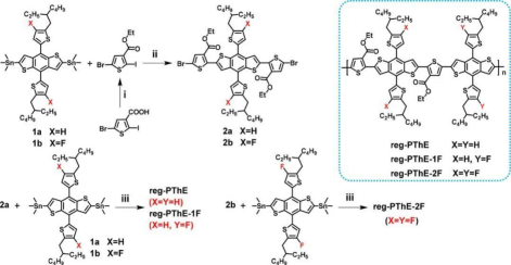 基于上述考虑因素,利用苯并二噻吩和羧酸酯基取代噻吩为D和A单元,设计并合成了三种D–A交替型宽带隙聚合物给体:reg-PThE、reg-PThE-1F和reg-PThE-2F。首先,羧酸酯取代基可以大大降低HOMO能级,从而确保器件能够获得较大的VOC;其次,逐步的氟取代可以进一步调节聚合物给体的能级和温度依赖性聚集行为。