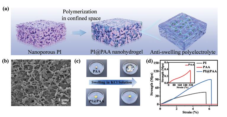 为了最大限度地发挥水凝胶的优势,同时克服其局限性,我们首次开发了一种在纳米多孔聚酰亚胺膜内原位聚合的抗膨胀3D纳米水凝胶。这种创新的复合结构具有出色的抗膨胀能力,膨胀率从纯水凝胶的593.2%降至37.5%,且尺寸没有明显变化。膜的机械强度达到89.5 MPa,比纯水凝胶的机械强度提高了2个数量级。值得注意的是,抗膨胀的3D纳米水凝胶还表现出优异的渗透能量转换性能,产生高达48.5 W/m2的功率密度,本文为解决渗透能量转换中膜的溶胀效应提供了新思路。