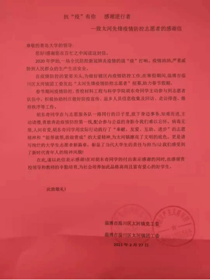 2020级胡东奇同学在寒假期间积极主动投身于志愿者的队伍中,积极协助村庄做好防疫宣传、返乡人员信息采集及回访、走访排查、维护秩序等工作。不辞劳苦,敢为人先,为国家防疫工作贡献了自己的力量,用自己的行动诠释了新时代大学生的责任与担当,用实际行动为建党百年献礼。淄博市淄川区太河镇党、团工委向青岛大学发来感谢信。