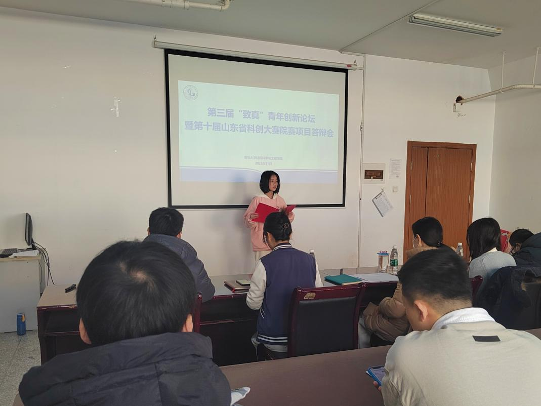 第三届“致真”青年创新论坛暨第十届山东省科创大赛院赛项目答辩会在浮山校区科技园D座406会议室举行。