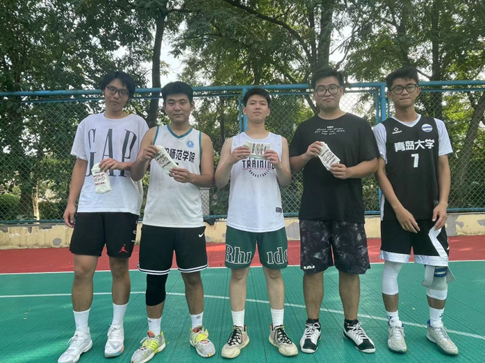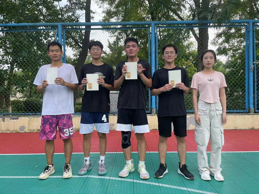 研究生会主席朱鹏博为队伍们进行了颁奖,本次比赛冠军奖品为篮球一枚,亚军为参赛队员手各一双篮球袜,季军为参赛队员人手一本笔记本。