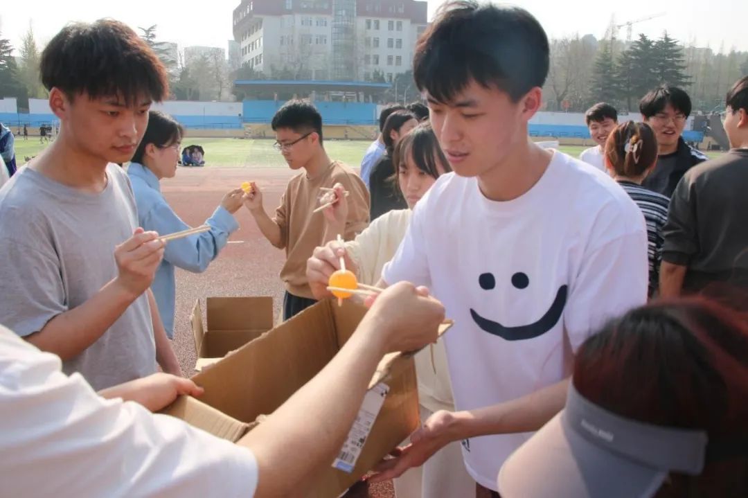 下一个项目是众志成城,首名队员用筷子从纸箱中夹起乒乓球,依次传至最后一名队员,由其放入终点纸箱,规定时间内终点纸箱中乒乓球数最多的队伍获胜。小乒乓球带来大麻烦,夹得稳准狠才是正解!