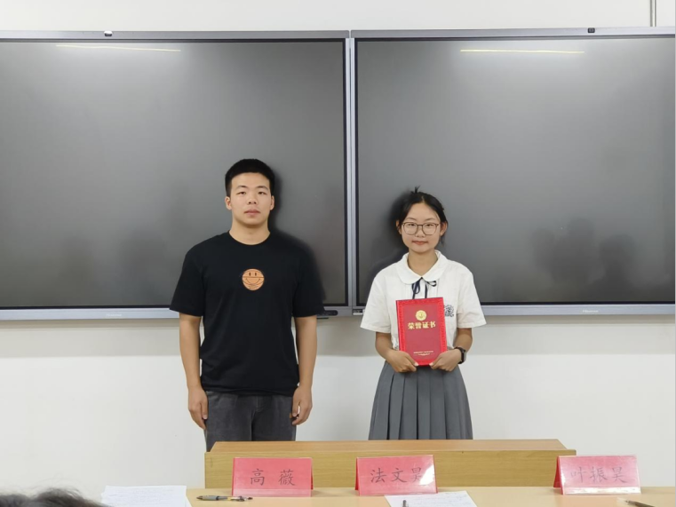 评委们不仅对参赛选手的认真态度与不懈努力给予了高度肯定,还以专业且客观的态度,全面分析了每位选手的优点与不足,并悉心提出了宝贵的改进建议。最后,由艺术小组部长高薇为程子懿和乔添添颁发三等奖证书;由青年先锋学社社长叶振昊为袁子琪颁发二等奖证书;由学生会执行主席法文昊为吴佳芮颁发一等奖证书。