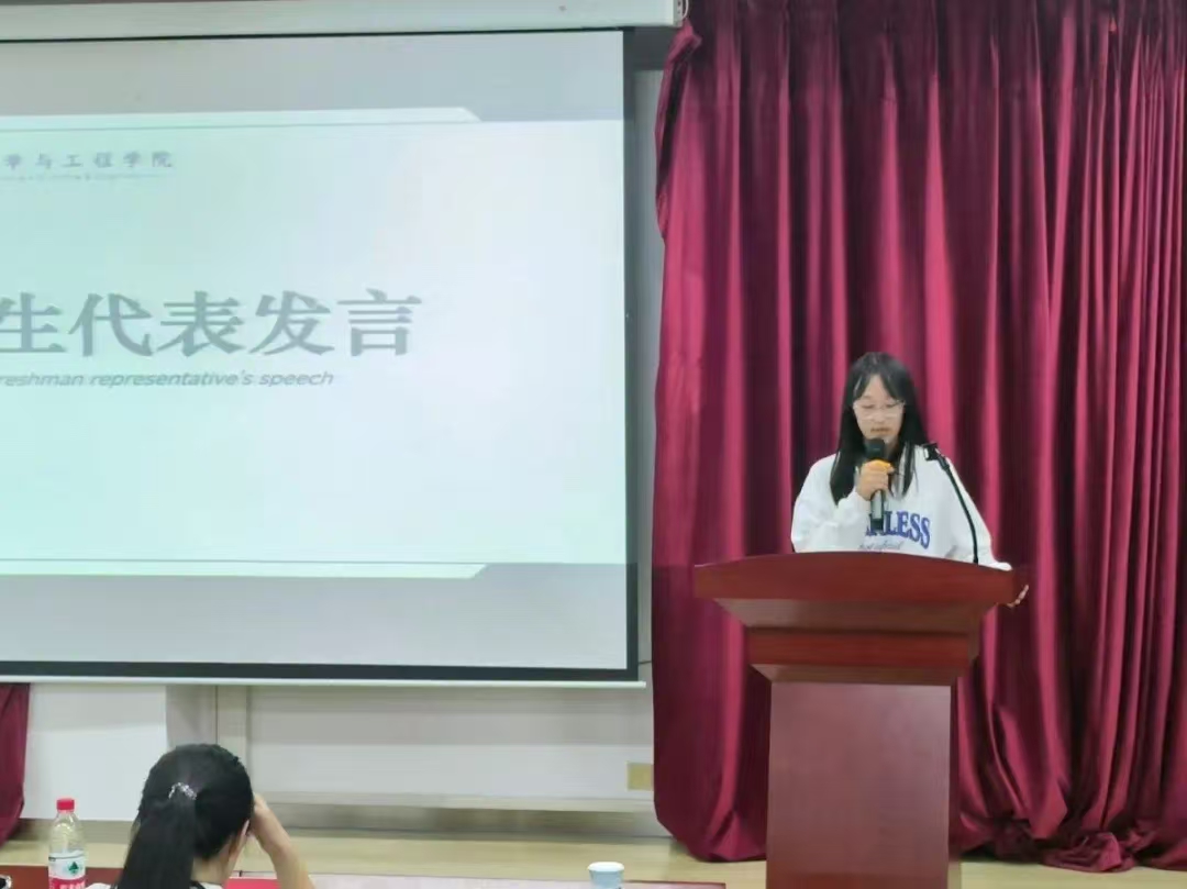 2024级孙慧敏代表新一届学生会志愿者发言。她分享了自己加入学生会的初衷和期望,并代表新生志愿者表明决心:将以饱满的热情和高度的责任感投入到学生工作中,时刻牢记自己的职责,勇于担当,脚踏实地,在团结协作中更好地为老师和同学们服务。