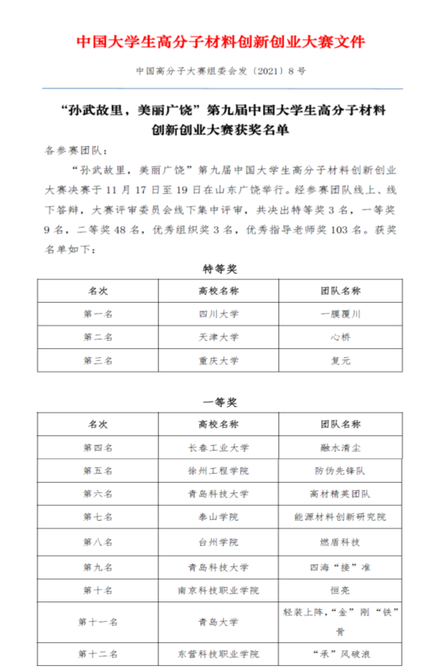 学生团队在中国石油和化学工业联合会、中国化工教育协会、中共广饶县委、广饶县人民政府和橡胶谷集团有限公司联合主办的“孙武故里,美丽广饶”第九届中国大学生高分子材料创新创业大赛(简称PMC大赛)决赛中获得一等奖1项、二等奖1项,马丽春老师获评优秀指导老师。