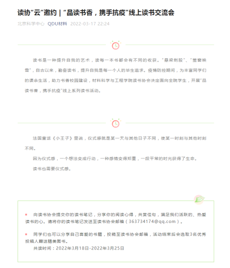 举办“品读书香,携手抗疫”线上读书交流会等活动,组织各年级同学积极参与学校举办的各类文化讲座,丰富同学们的课余生活,助力书香校园建设。