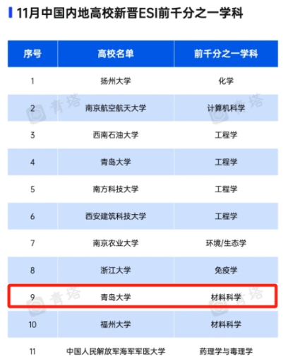2024年11月14日,科睿唯安发布ESI最新数据显示,我校材料科学学科首次进入ESI全球前1‰学科行列,这也是山东省属高校材料科学学科中首个进入全球前1‰的学科,标志着我校材料科学学科科研实力和学术影响力显著提升,在全球顶尖学科领域实现了重大突破。