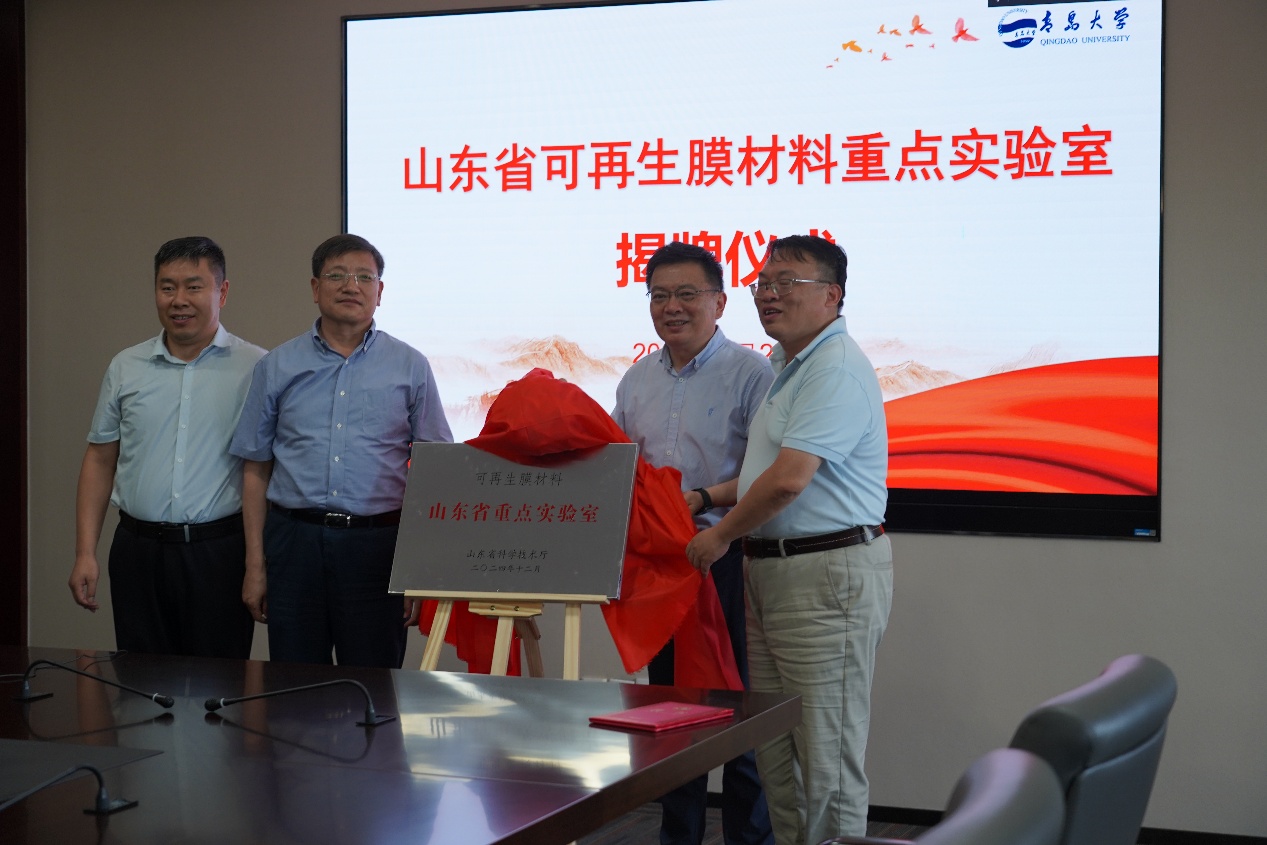 之后,郑蕾宣读了《山东省可再生膜重点实验室学术委员会名单》,魏志强向受聘的学术委员会委员颁发了聘书,并对各位学术委员表示感谢。魏志强、黄林军、黄晓宇、张军共同为“山东省可再生膜材料重点实验室”揭牌。