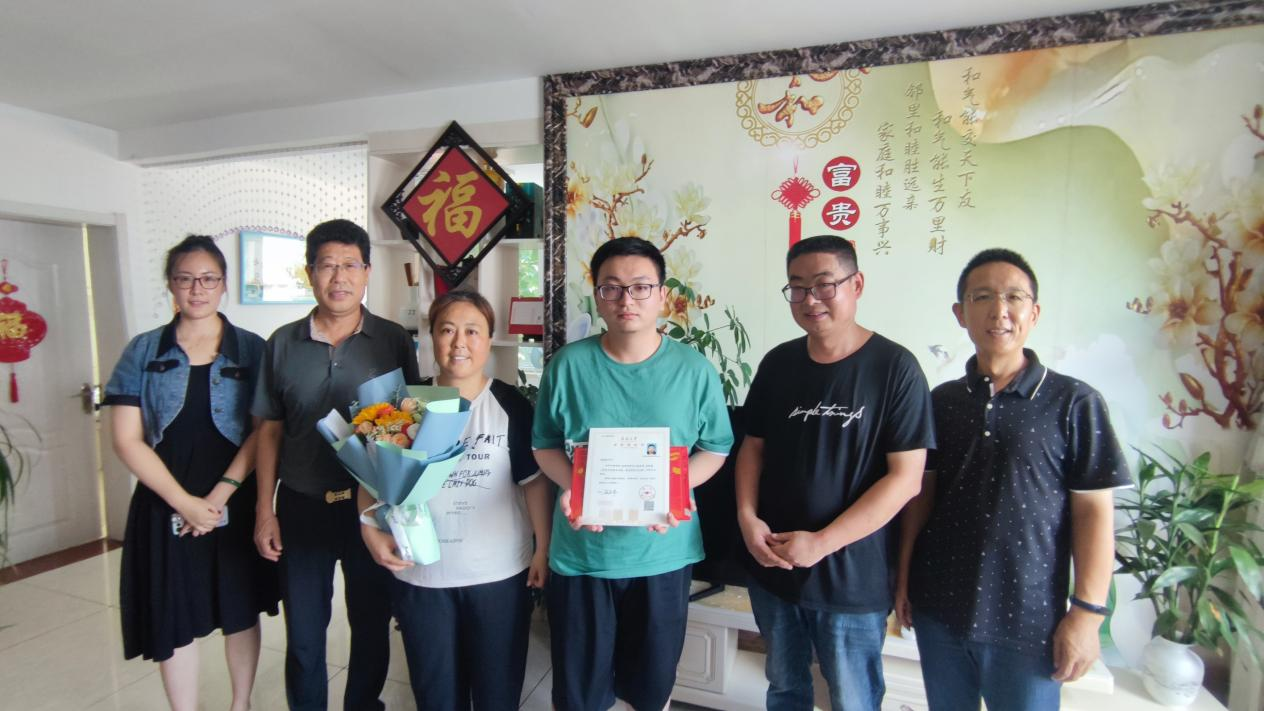 党委书记万宗喜、党政办主任薛玉章、学工办主任林国红一行来到胡伟昊同学家中,万书记亲手将这份惊喜带给了他。