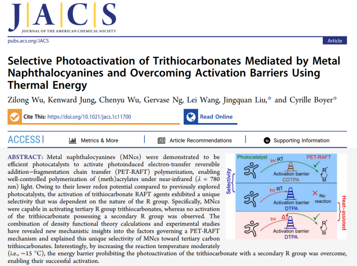 刘敬权教授和Cyrille Boyer教授多年致力于发展基于光控“活性”聚合的高分子材料合成方法,即photoinduced electron/energy transfer reversible addition-fragmentation chain transfer(PET-RAFT)。近年来,PET-RAFT聚合因为其优越的氧气耐受性及其在可见光、甚至在近红外光下展现的可控性被广泛应用在多种聚合物材料合成场景中。值得注意的是,光催化剂的选择对PET-RAFT聚合具有关键影响,使聚合能够在特定波长的光(从蓝色到近红外波长)下选择性地执行。近年来,对PET-RAFT聚合体系的探索进一步揭示了一些光催化剂对某些 RAFT 试剂具有独特的选择性,从而实现了精确单体插入和复杂聚合物结构(例如接枝或梳状共聚物)的合成。虽然这些对RAFT试剂具有独特选择性的光催化剂已经被报道在各类期刊上,但目前还没有工作利用计算化学来探究和揭示这种在PET-RAFT聚合中存在的光反应选择性。在此基础上,刘敬权教授团队和新南威尔士大学Cyrille Boyer教授团队合作,利用金属萘酞菁作为光催化剂并实现了对三硫代碳酸酯RAFT试剂的选择性光活化。具体而言,在室温下金属萘酞菁能够在近红外光的调控下激活具有叔碳R基团的三硫代碳酸酯并可引导丙烯酸酯可控聚合,而具有仲碳R基团的三硫代碳酸酯却不能被其激活并且聚合转化率始终为0%。这种对于不同R基团的三硫代碳酸酯的光活化选择性是前所未见的。此外,本文工作结合了密度泛函理论(DFT)量子化学计算和实验上的探索与表征,揭示了在机理上控制PET-RAFT聚合的关键要素并探究和解释这种独特选择性。有趣的是,通过适当提高反应温度(提高约15℃),此光催化剂可以克服具有仲碳R基团的三硫代碳酸酯光活化的能垒,使其成功引导光可控聚合。在光聚合反应机理的研究上有着良好的指导作用,并在功能性聚合物材料合成、光热催化等方面具有很大的应用潜力。