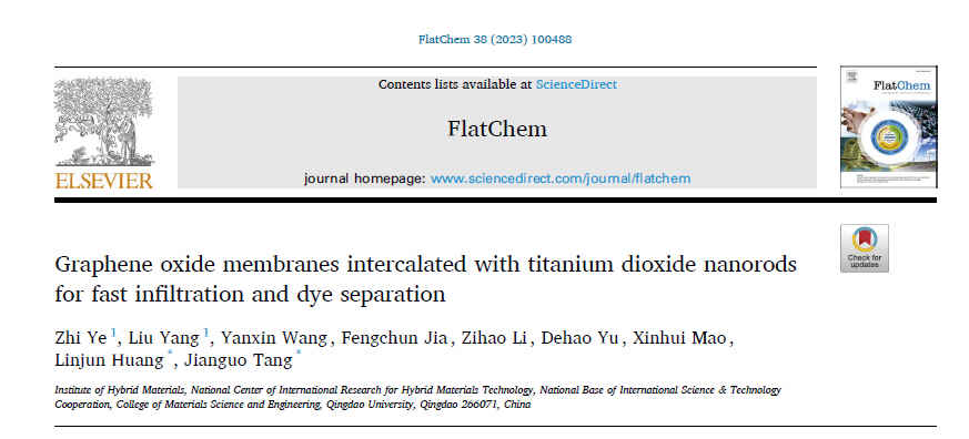 2020级高分子材料与工程创新班本科生叶芷在石墨烯基杂化纳滤膜研究领域取得新进展,研究成果以“Graphene oxide membranes intercalated with titanium dioxide nanorods for fast infiltration and dye separation”为题发表在国际期刊《FlatChem》上(DOI: 10.1016/j.flatc.2023.100488),该期刊为SCI收录期刊(2022年影响因子5.829),是Elsevier旗下第一份专注于石墨烯及相关二维和分层材料最前沿研究的期刊。叶芷是论文第一作者,指导教师和论文通讯作者为黄林军教授和唐建国教授,青岛大学为第一单位和通讯单位。