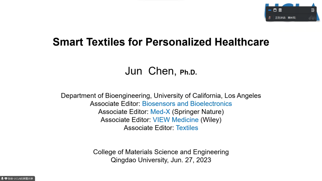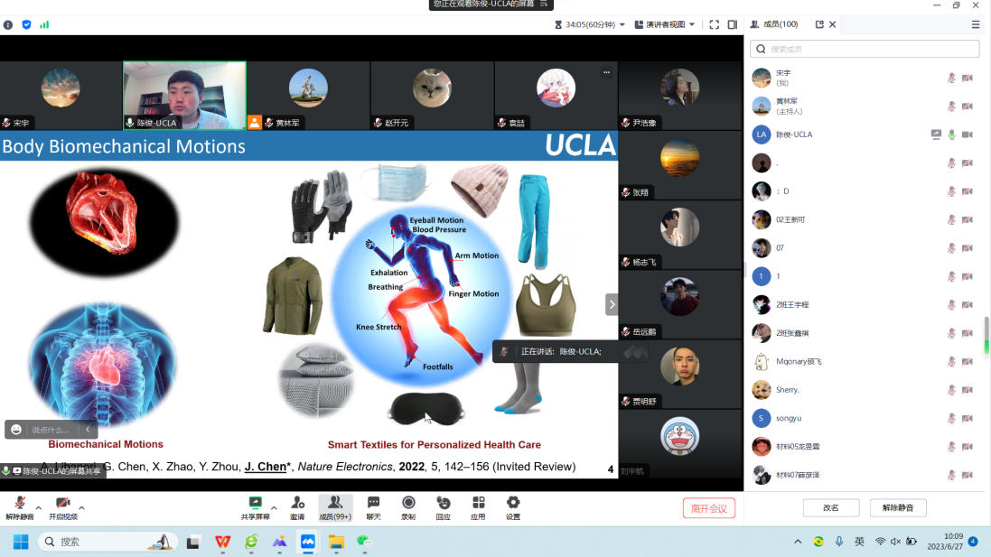 2023年6月27日上午,美国加州大学洛杉矶分校陈俊教授应电子游艺 邀请,作了题为《用于个性化医疗的智能织物》的高端学术报告,报告由黄林军副院长主持,采用线上腾讯会议的方式,百余名师生听取了报告。