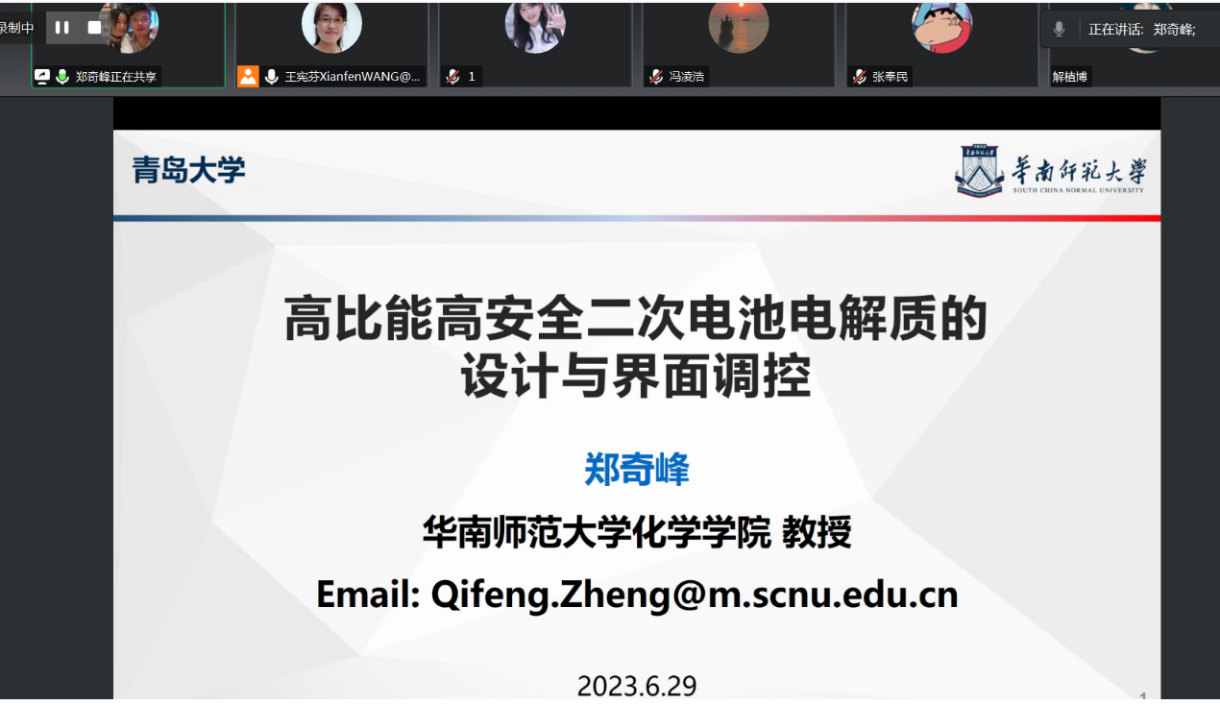 2023629日上午,华南师范大学郑奇峰教授应电子游艺 邀请,作了题为《高比能锂电池电解液的设计与界面调控》的高端学术报告,采用线上腾讯会议的方式,百余名师生听取了报告。