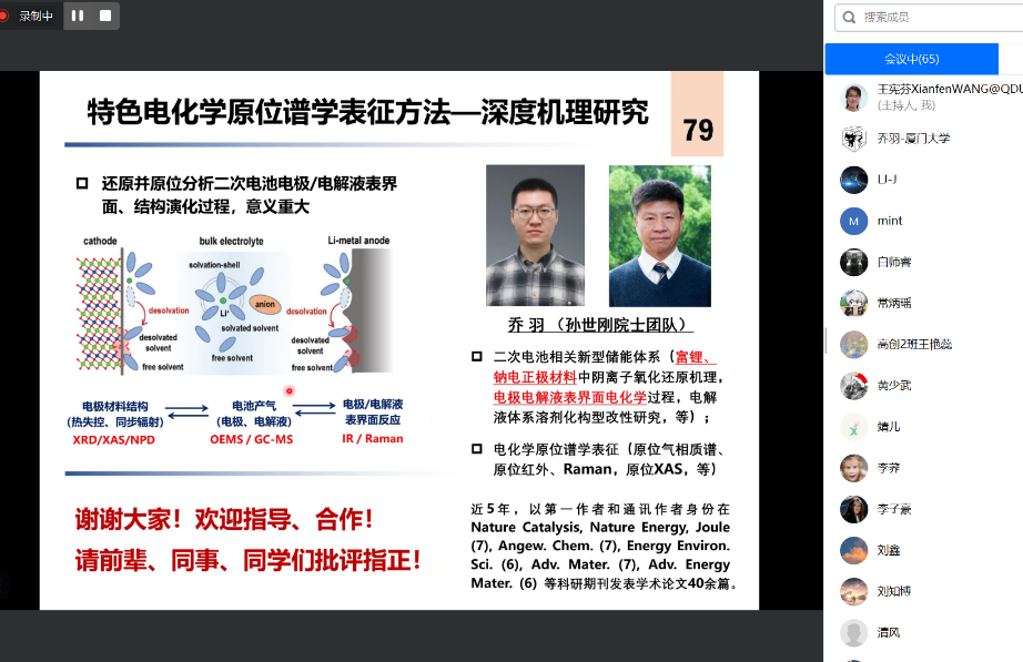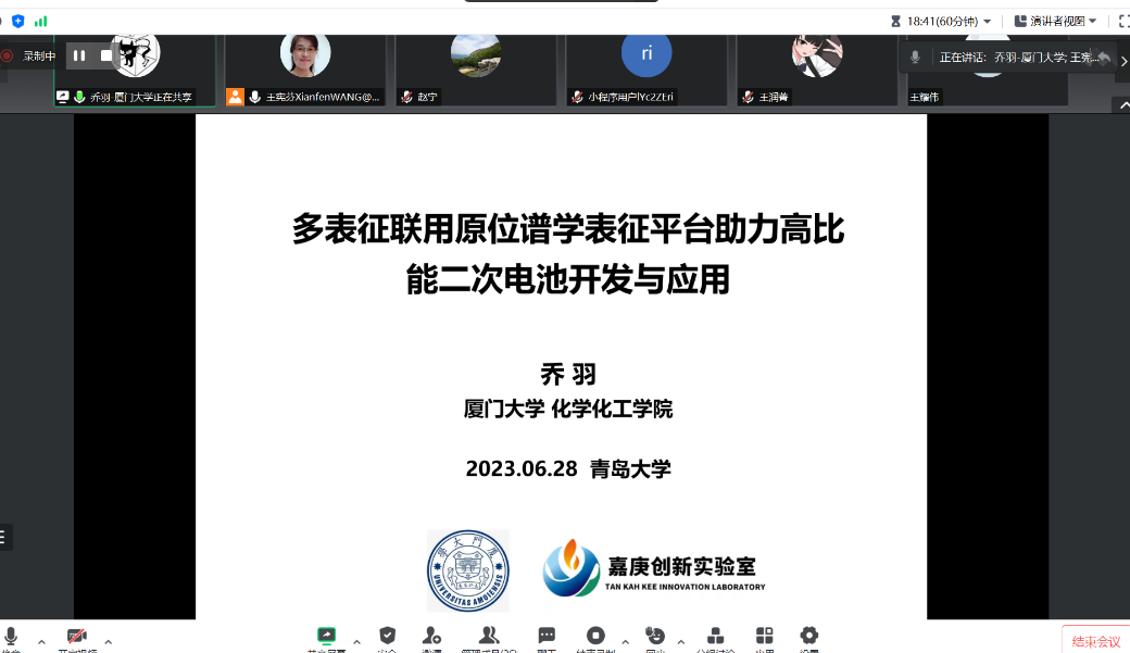 2023629日下午,厦门大学乔羽教授应电子游艺 邀请,作了题为《多表征联用原位谱学表征平台助力高比能二次电池开发与应用》的高端学术报告,采用线上腾讯会议的方式,近百名师生听取了报告。