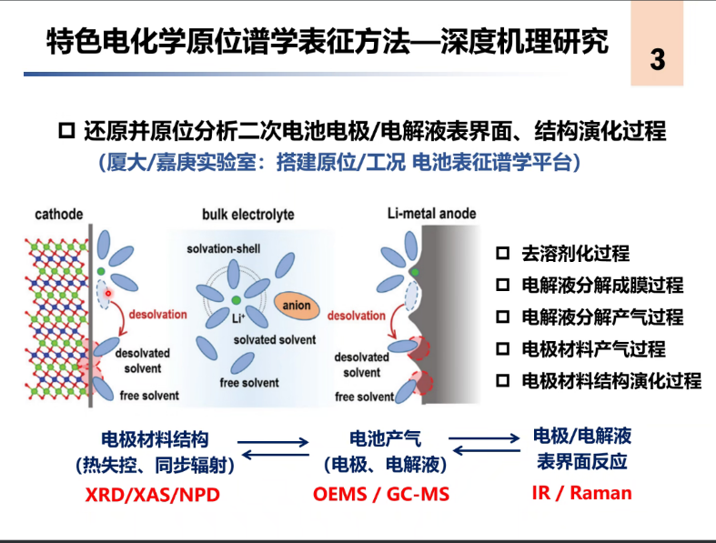 报告中,乔教授以探索重要新型二次电池体系中电化学氧化还原机理为出发点,设计并搭建针对二次电池体系的原位谱学表征测试平台,进而原创性的发现和阐明了一系列重要反应中间产物在相关电池反应过程中的独特工作原理,为相应体系的材料研发提供重要的设计思路。