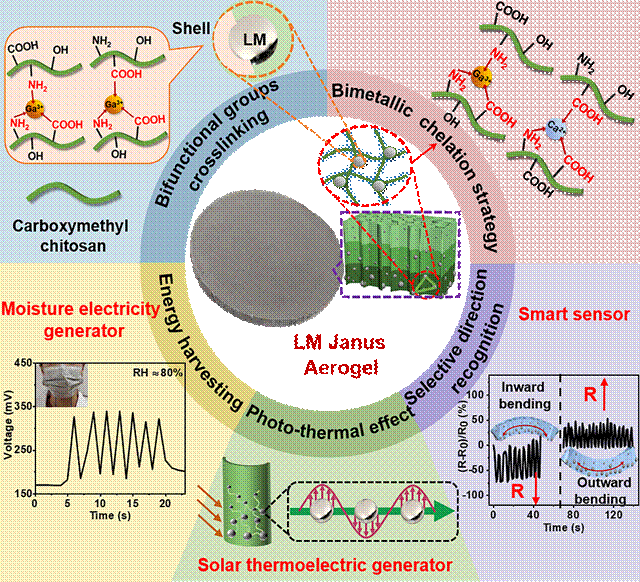 液态金属具有良好的导电/导热特性和良好的流动性,是制备功能化柔性电子的理想材料。但是液态金属超高的表面张力,难以实现加工成形和功能化。虽然通过微纳化处理,能够有效降低其表面张力,但是由于其高密度和活跃的表面特性,获得稳定的液态金属微纳液滴仍然是一个巨大的挑战。针对以上问题,该团队提出双官能团协同锚定策略,在液态金属微纳液滴表面构建了坚固的外壳。即在羧甲基化壳聚糖(CMCS,含有丰富的羧基和胺基)溶液中对液态金属进行超声,制备了化学稳定性较高(> 7 d)的液态金属分散液,再通过定向冷冻干燥的方法制备出具有Janus结构的气凝胶。