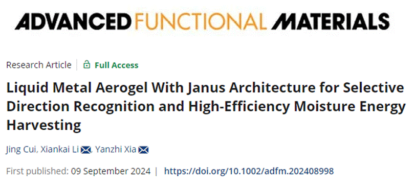 在材料领域顶级期刊《Advanced Functional Materials》上发表题为“Liquid Metal Aerogel with Janus Architecture for Selective Direction Recognition and High-Efficiency Moisture Energy Harvesting”的论文(DOI:10.1002/adfm.202408998),论文的第一单位为电子游艺-十大电子游艺